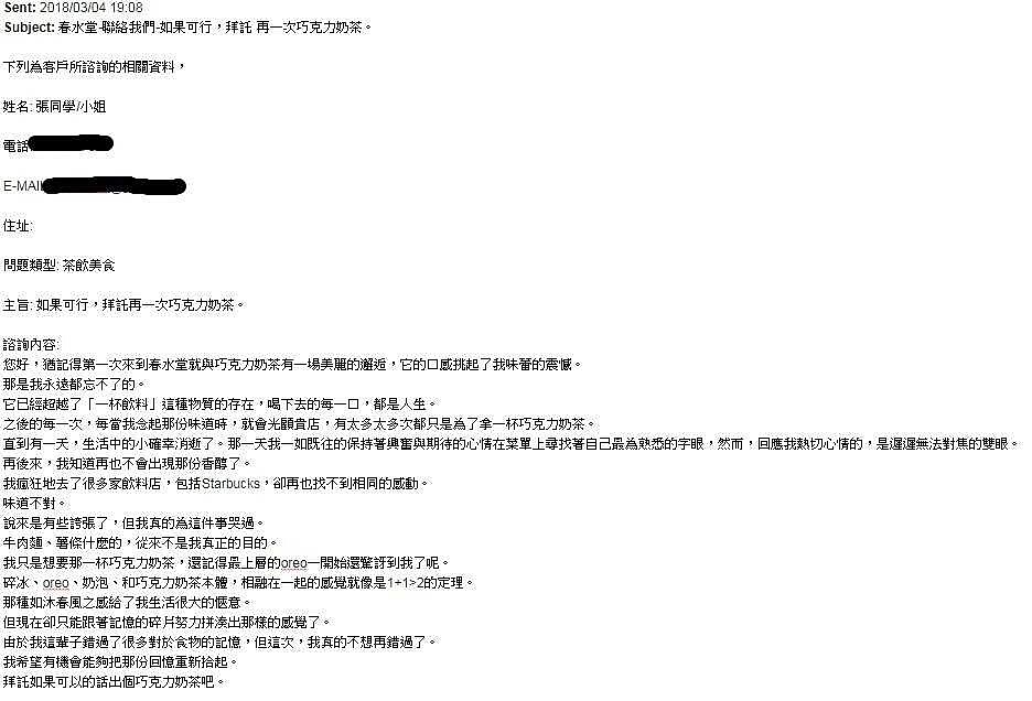 沒想到春水堂的創辦人劉漢介先生得知之後,被張同學的執著與熱情給感動,因此決定讓巧克力奶茶重回市場,也為了感謝張同學的喜愛與支持,並致贈邀請函與兌換券。
