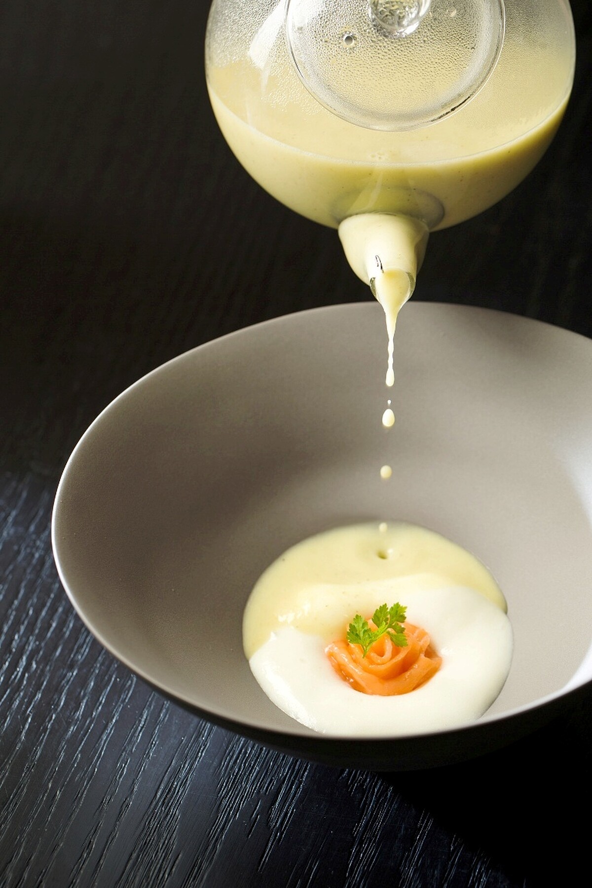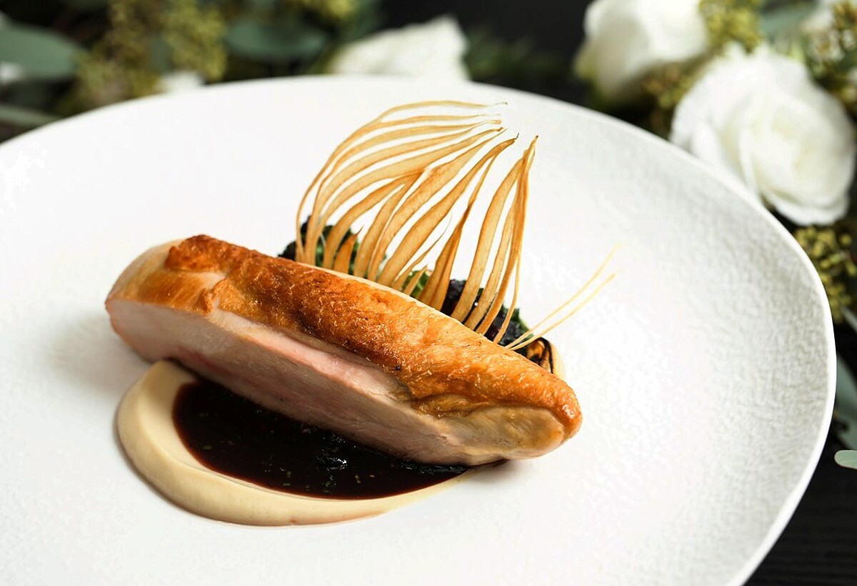 冬日暖心療癒,對女生來說絕對不能少了熱熱的濃湯。實習生首推將蒜苗蒸軟再炭烤增添風味,搭配鮭魚花與艾碧斯酒提香的鮭魚花薇琪濃湯,以及透過烤、油封、炒、煎手法將鴨肉呈現四種口感的鴨‧六小福派餅,細膩的口感以及富郁的香氣,都是讓人驚艷,也一口吃出法國料理魂的必點菜式。