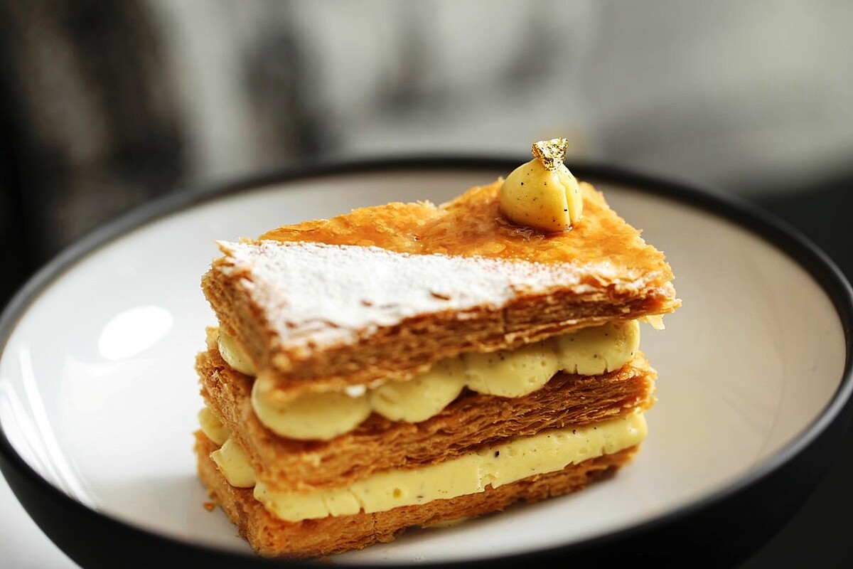 擁有專門甜點主廚坐鎮店上,在試營運階段就受到高度評價的千層派,果然因為主廚以繁複的反摺法桿製,採用艾許奶油烤出鬆脆香的法式香草千層。以及有別傳統口味,加入陳年萊姆酒及伯爵茶香味道的蒙布朗,還有使用來自小山園抺茶粉的抺茶聖多諾黑泡芙塔也是來店必嚐甜點之一。