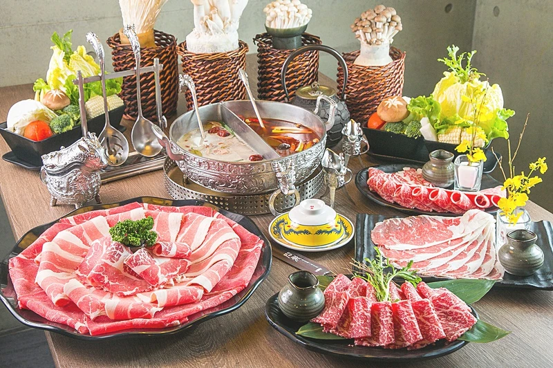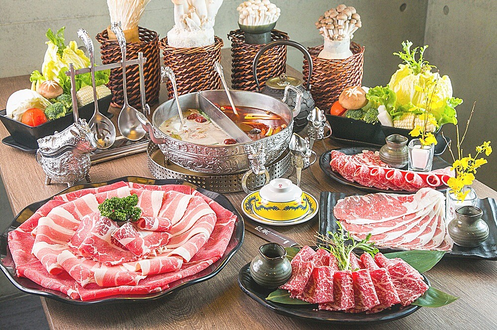 湯底部分以招牌的麻辣湯底與胡椒豬肚雞湯組合的鴛鴦鍋最具人氣,搭配問鼎獨家推薦18盎司花開富貴牛拼盤,一次可享用三種部位的美國牛肉,包含Choice牛五花、Choice無骨牛小排與美國安格斯黑牛的牛背肩。可先從瘦肉比例較高的美國安格斯黑牛背肩開始入鍋,接續享用油花比例最高的牛五花,最後則是7秒涮煮大理石油花的無骨牛小排。
