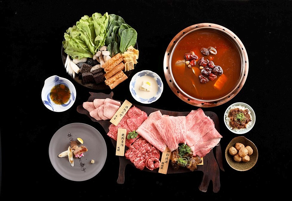 兩款湯底都會附上蔬菜盤及豐富手工鍋料、開胃前菜、和牛滷肉飯、四川擔擔麵、甜點。可別小看任何一道配菜,開胃菜是新鮮鮑魚;淋上麻辣汁的和牛肉滷肉飯或擔擔麵都是把肚胃撐飽到極限也要吃下肚的極致美味。