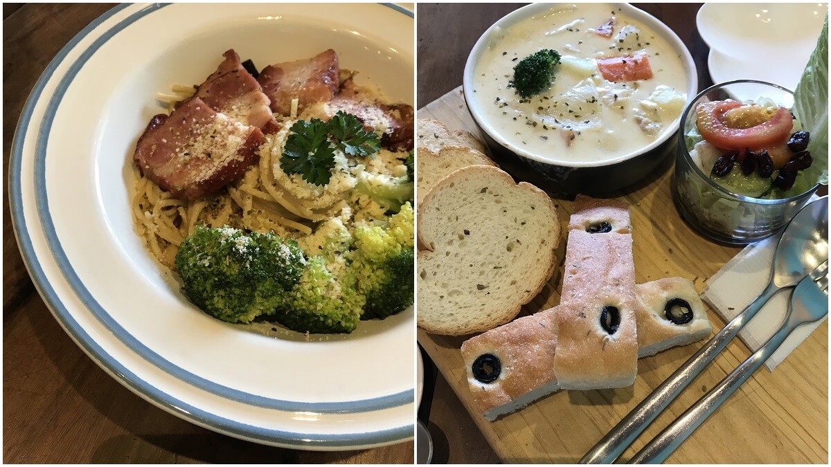 老闆說雖然很多客人會來點一杯飲料跟甜點,但店內熱賣的其實是餐點。像是厚切培根蒜片義大利麵、花枝干貝義大利麵及蕃茄燉很多種菜燉菜,都是非常受歡迎的料理。