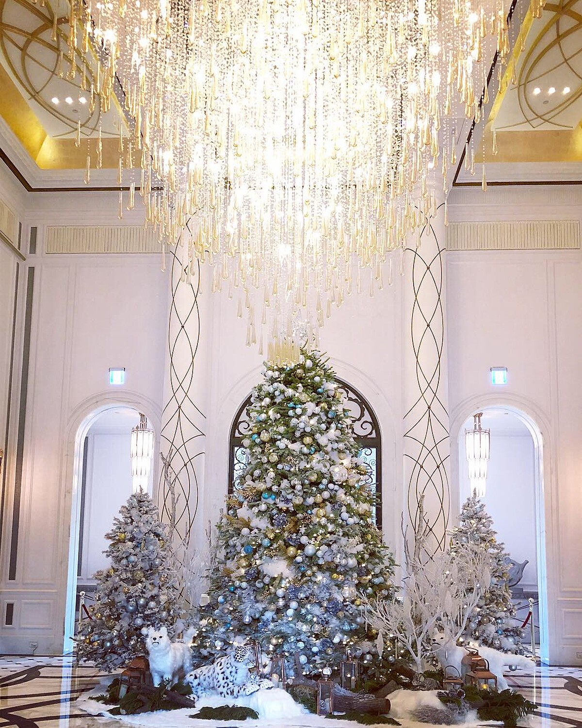 首先不能錯過的,當屬午茶空間青隅了。入口處有如掛冰般的水晶燈下,布置了聖潔如靄雪降臨的全白聖誕樹,和去年白兔主題相異,今年樹下雪豹寶寶和白狼齊聚,更有踏入冬日北國極地的浪漫。