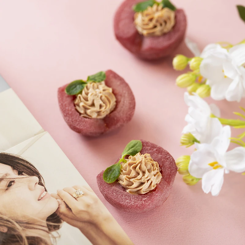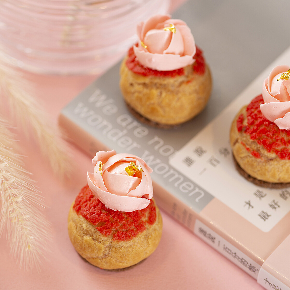 【玫瑰巧克力泡芙】說到愛,總讓人立刻聯想到玫瑰花與巧克力,因為玫瑰與巧克力常被人們用來表達愛意,在第三章「放輕鬆,我們不一定要當Wonder Woman」裡,Melody提到女人的公主夢,於是主廚將這兩個代表愛情的元素加在一起,托著嬌豔粉嫩花瓣的是有著濃郁巧克力內餡的手工泡芙,就像每個女孩心裡總希望能像公主一樣被王子捧在手心裡。【珍珠蜜桃漿果起司蛋糕】這款充滿女人味的起司蛋糕,恰到好處的酸甜,外型優雅且吸睛滿分的珍珠造型,唯妙唯肖的細緻手工,讓人情不自禁想戴上珍珠項鍊,如同第四章中「好好喜歡、現在的自己」裡提到Melody的奶奶至今還常常精心打扮,跟一輩子的姊妹們優雅地喝茶談心,分享生活點滴!【紅酒洋梨襯雞肝慕斯】這款莫蘭迪紅的紅酒洋梨,美麗精巧視覺效果滿分,上層堆滿香濃滑順的法式雞肝,彷彿來到時尚派對裡,那個一手香檳一手小食的優雅,正如Melody闡述的「女人不用完美,但一定要美!」
