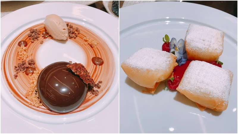 甜點的部分,非常推薦「香脆奶油酥配覆盆子果醬」,將奶油炸至金黃程度,吃起來超級脆口,如果喜愛巧克力的話,則必點「巧克力炸彈配鹽味焦糖榛子冰淇淋」。