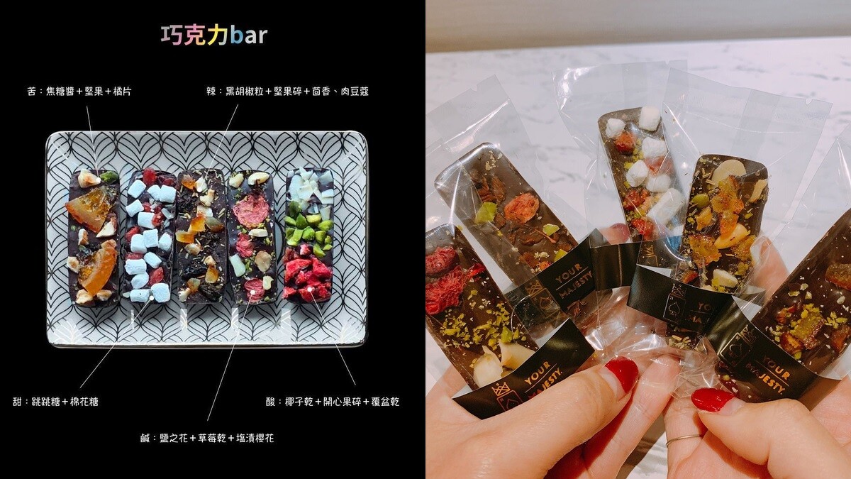名為「人生五味好棒棒」的巧克力棒禮盒,將巧克力與跳跳糖、鹽之花、黑胡椒粒、草莓乾、堅果脆...等食材創作出10款巧克力五種味蕾口感,分別有5款方形巧克力以及5款巧克力bar,希望品嚐這份人生五味巧克力的同時,可以將今年的酸甜苦辣鹹轉換成為明年的動力。