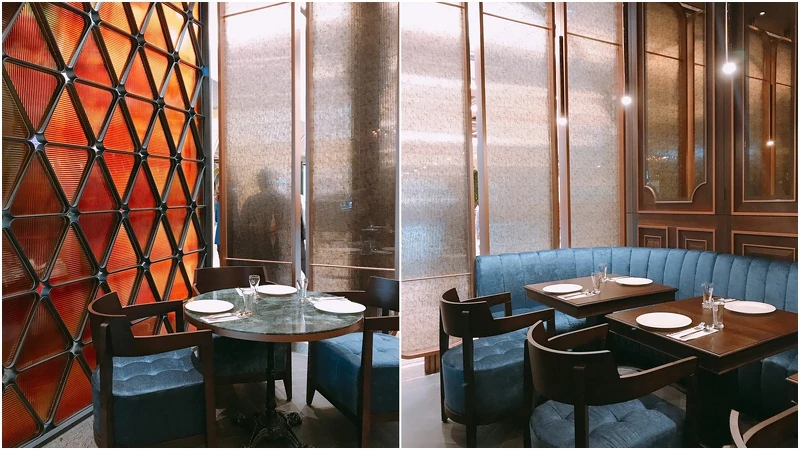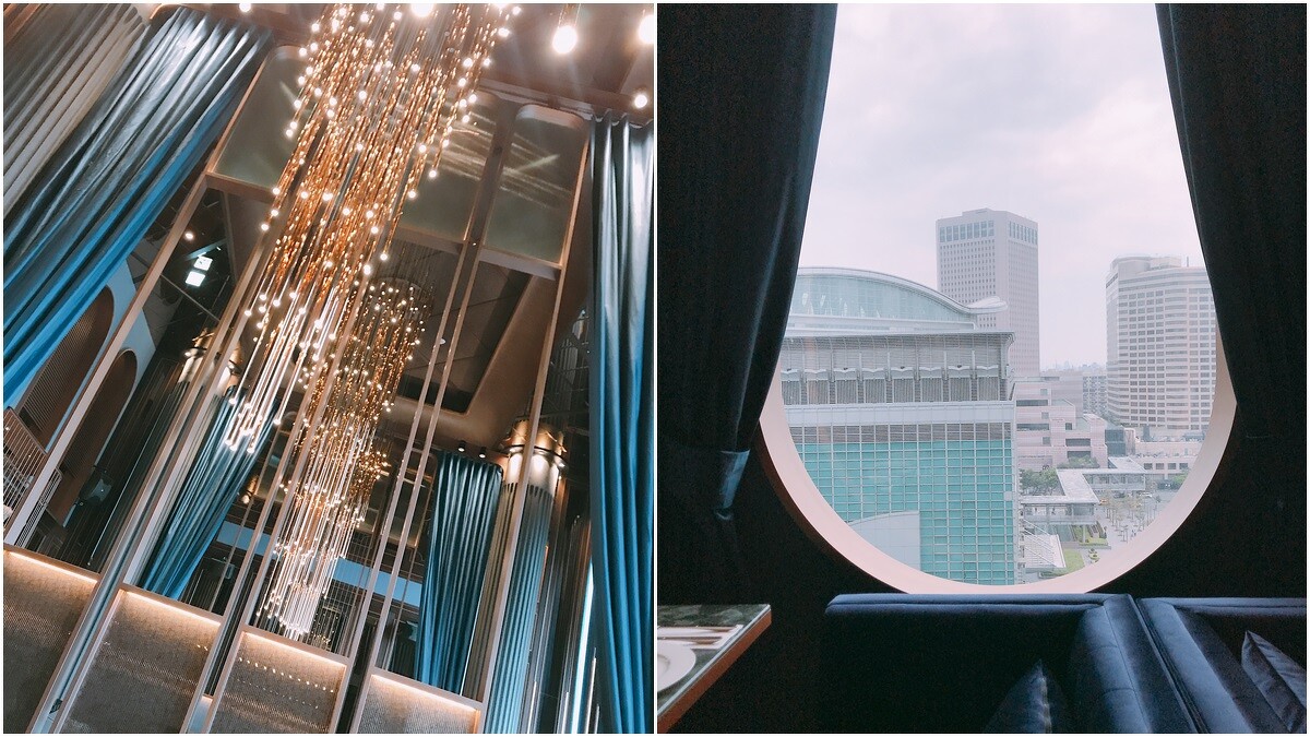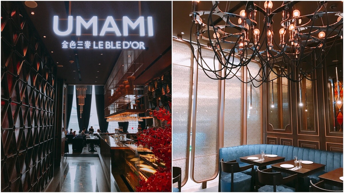 以挑高九米的用餐空間,優雅深藍搭配古銅金的色系,加上大理石紋的餐桌,還有各種不同造型的浮誇吊燈點綴,UMAMI金色三麥創造出品牌全新概念,更強調奢華的用餐感受。