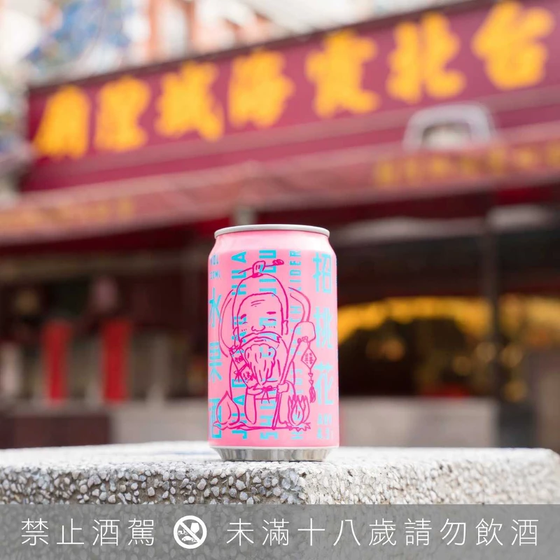 有著粉紅色浪漫瓶身,臺虎精釀這回以家喻戶曉的「月下老人」作為主題視覺,而「招桃花水果酒」命名靈感來自其釀酒原料「水蜜桃」、「洛神花」,加上基底蘋果酒釀製而成。