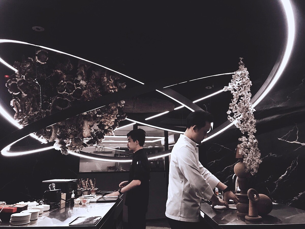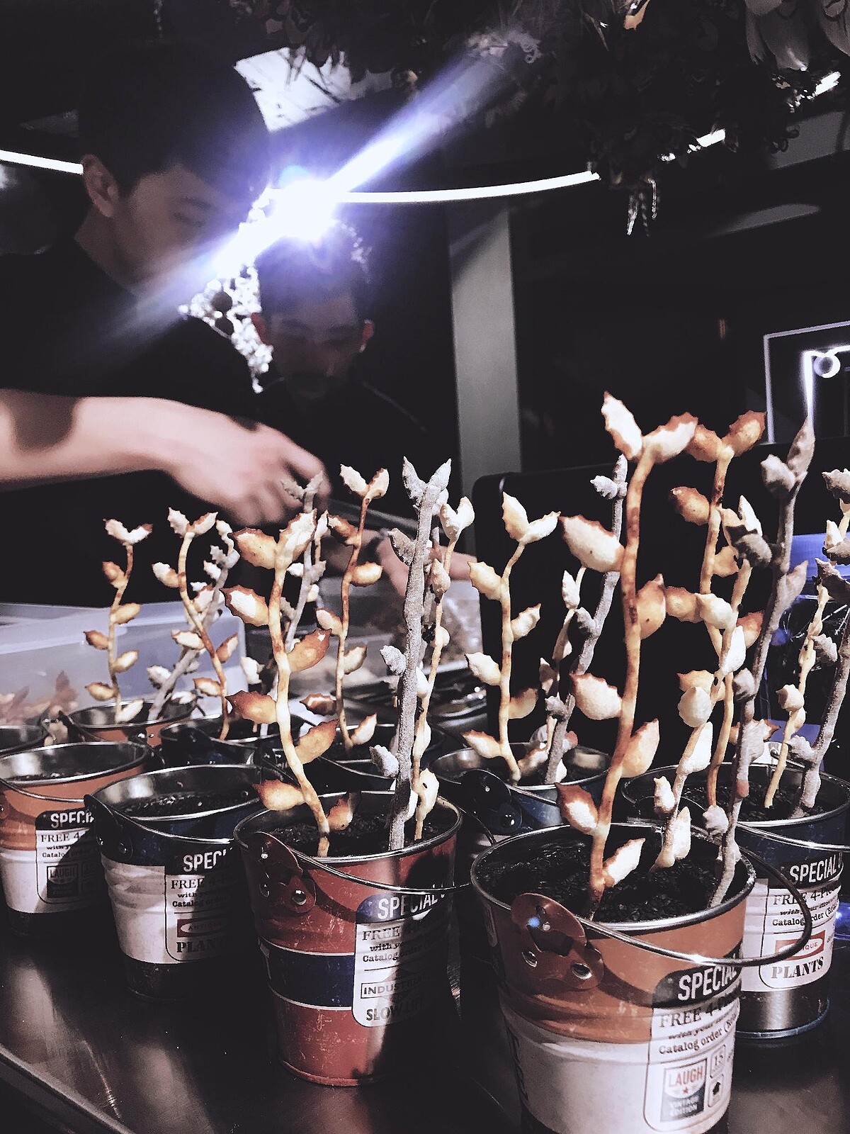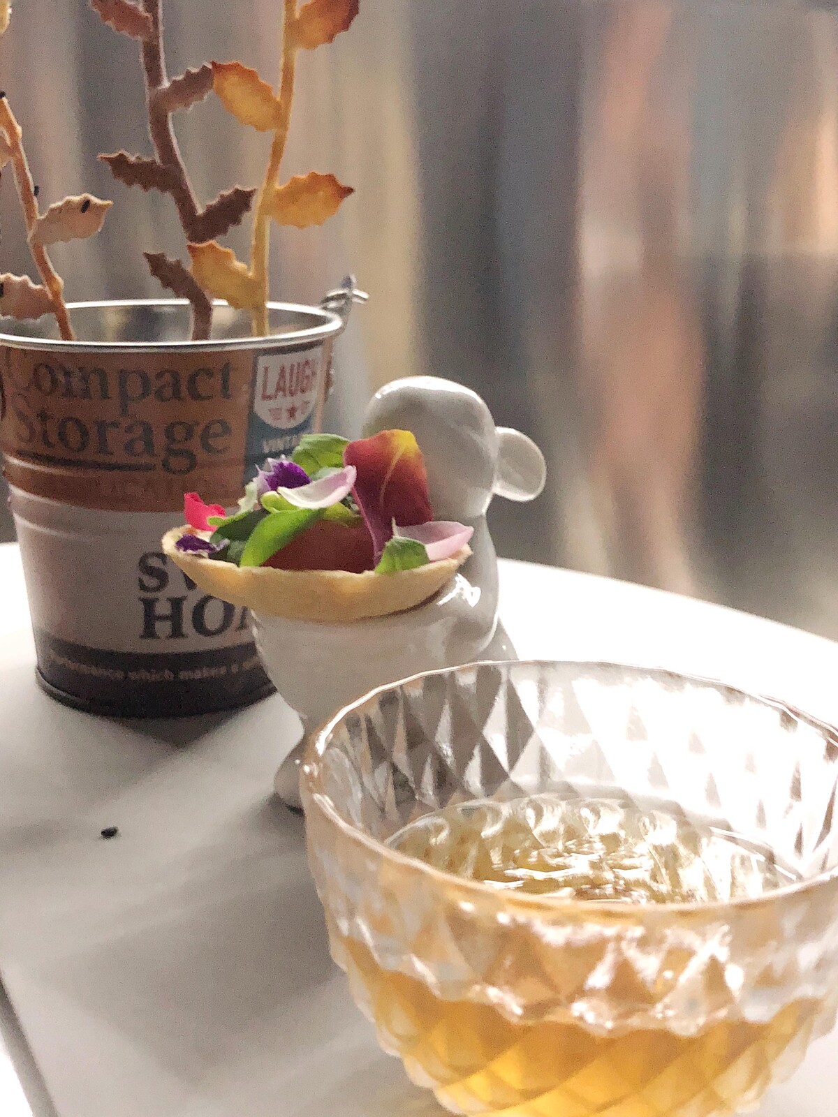 前菜送上可愛小白兔捧花手指小點,元素以台式醃菜靈感,創造出雪裡紅、山藥與蛋黃(醬油醃製)或蘿蔔泥概念組合。搭配生薑萃取基底,滴上麻油與醬油,口感溫潤又暖胃。