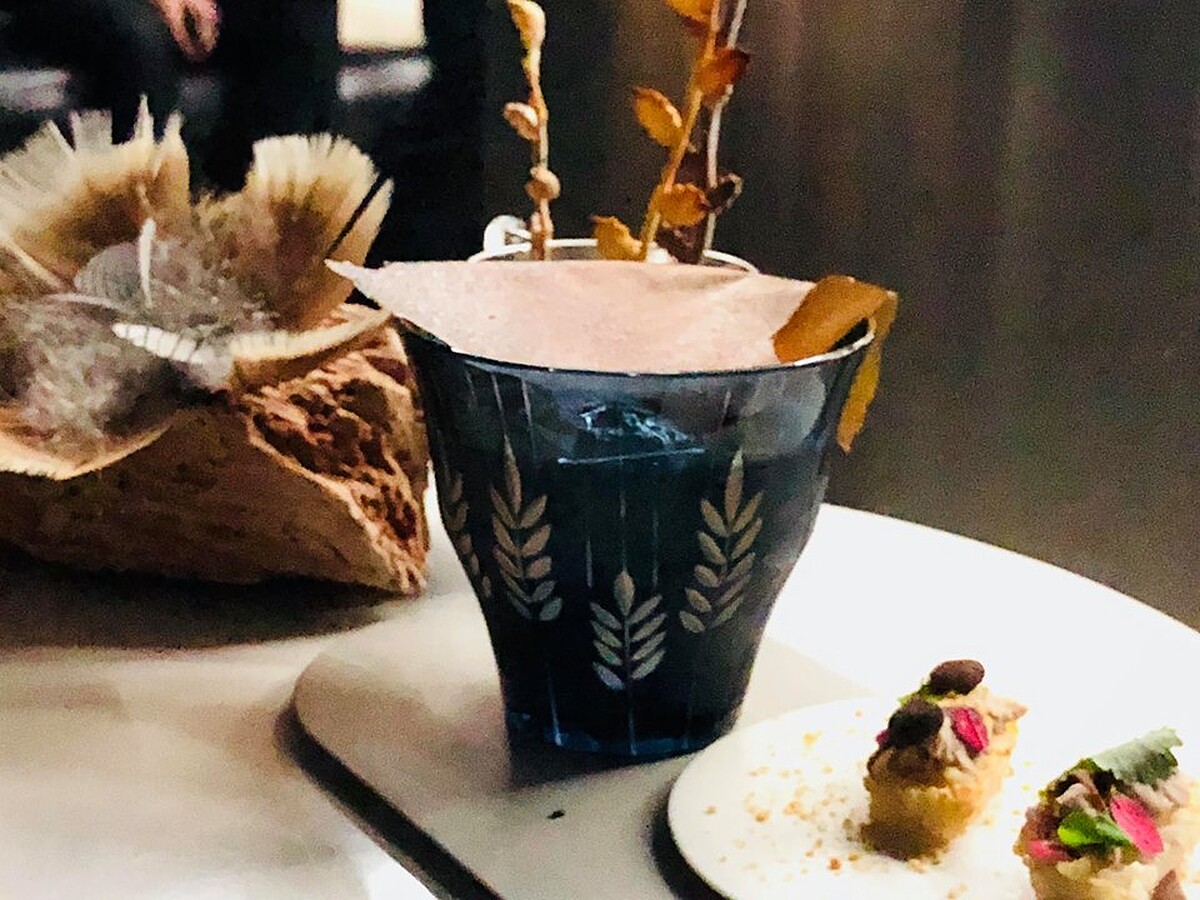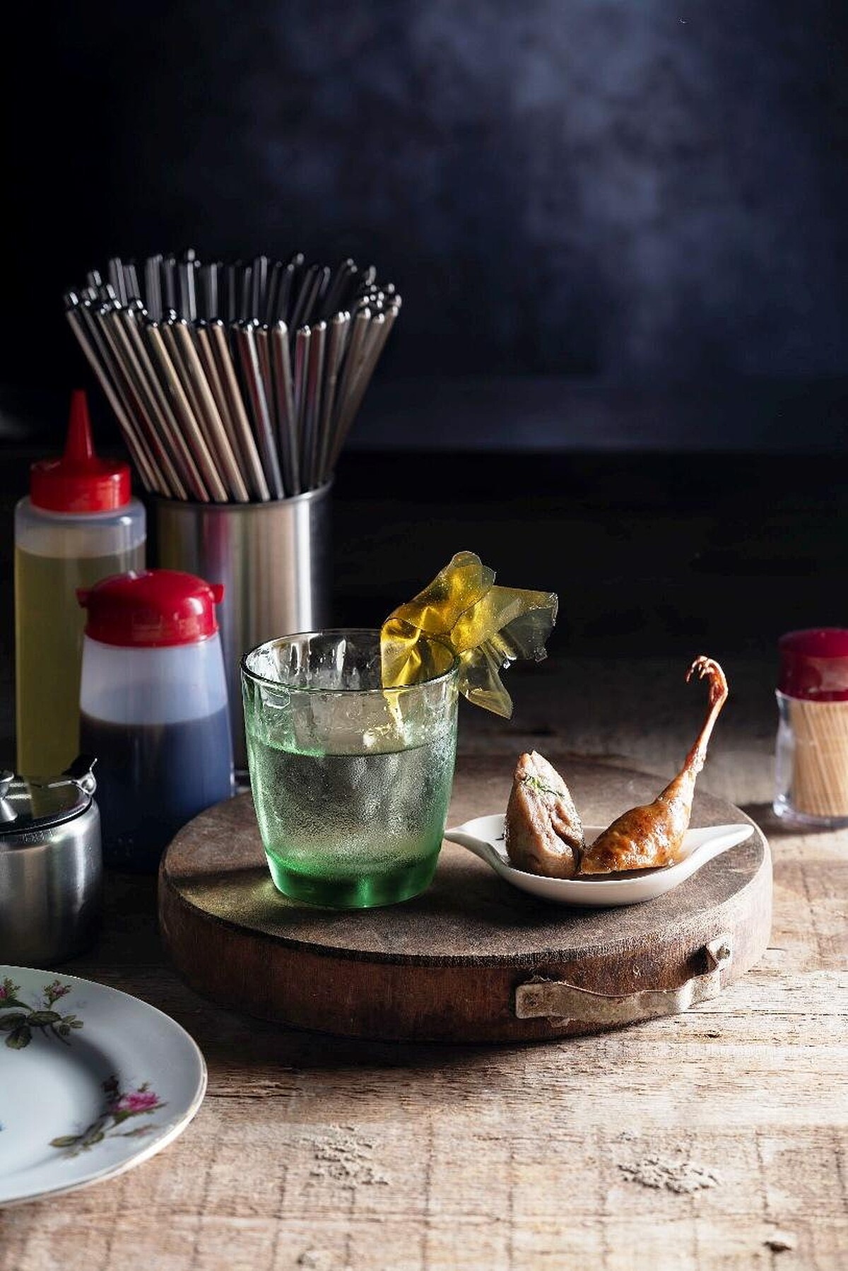 花椒番茄萃取搭配丁香、八角、肉桂,以及醬油製薄片香辣椒麻調飲;