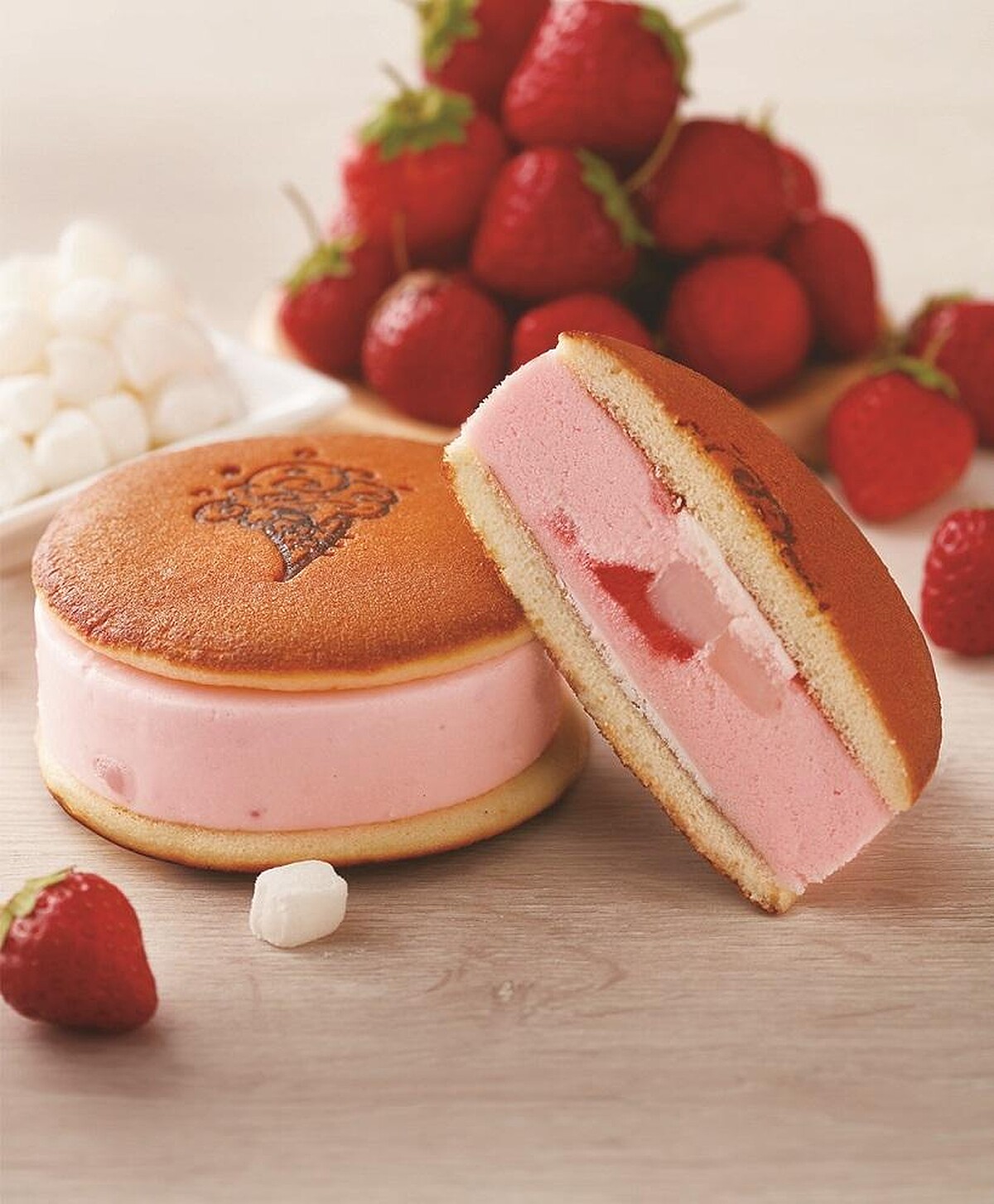 「濃!草莓白玉冰銅燒」嚴選『雙倍』新鮮熬煮的草莓醬製成草莓冰淇淋,讓夾心都吃得出草莓酸甜好滋味,餅皮還有淡淡的蜂蜜香,重點是還加入了超人氣Q彈白玉麻糬讓口感多層次更豐富。