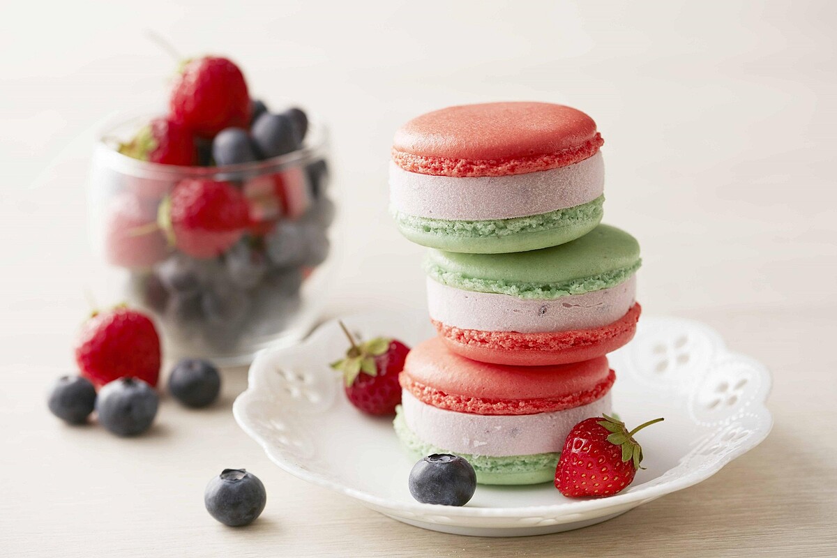 「野莓馬卡龍冰淇淋」以草莓、藍莓、覆盆莓三種暢銷莓果打造,更將2019年PANTONE代表色珊瑚橘結合草地綠,就是要激出你的少女心~