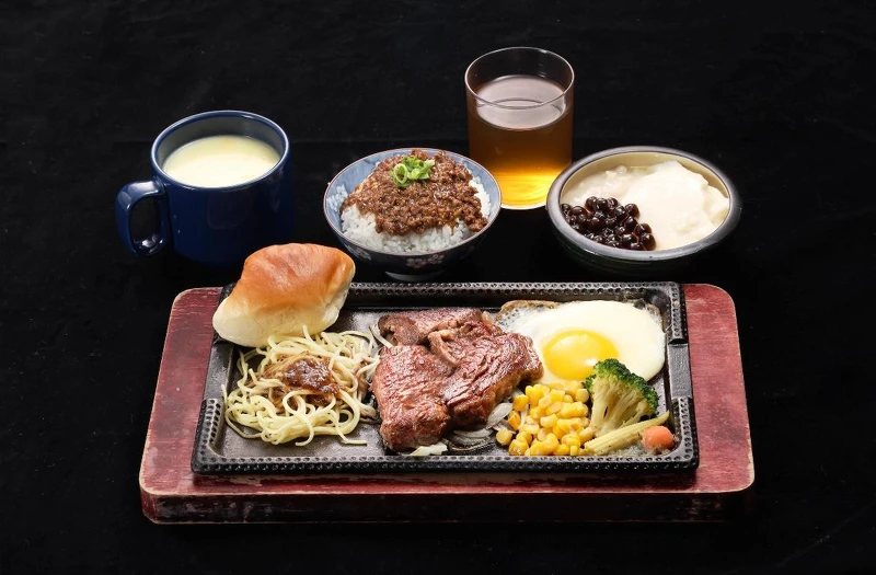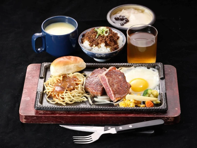 美味不馬虎。由廚師細工手切,先鐵板香煎,再以超級烤箱高溫炙烤五分熟,搭佐太陽蛋、麵條、時蔬以復古鐵板裝盛。