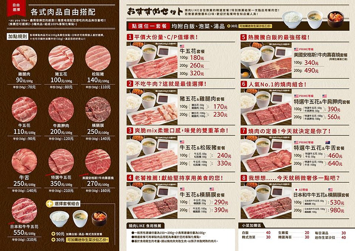 餐點內容包括燒肉、白米飯、湯和泡菜,點餐後3分鐘內就能享用,可選擇部位、量、醬料,包括有牛五花、豬五花等8款各式單人套餐。