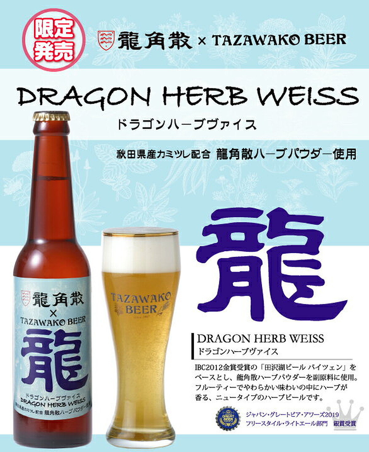 介紹文字提到,隨著2018年4月,日本酒類稅法修訂之後,啤酒釀造的輔助材料範圍不斷增加擴大,因此Tazawako Beer在與龍角散的協力合作下,發展出這款藥草型的啤酒,草藥是來自秋葉縣獨家栽種的品種,具有藥草香氣與果香。