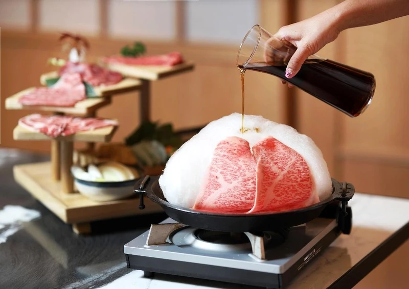 獨家秘製壽喜燒醬汁由日本醬油、清酒、味醂特殊比例調製,再燒煮日本A4和牛紐約克、日本A5和牛肩捲、澳洲9+和牛板腱、澳洲9+和牛肩小排、西班牙伊比利豬梅花等五個部位,不只好吃,甜蜜風味增添肉片金燦燦的嗅覺視覺饗宴。