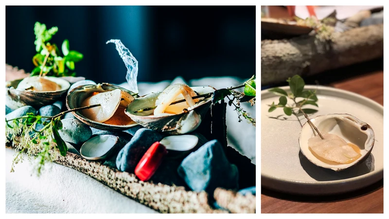 重回地球本質,料理緊繫環保:用蜂蠟取代蜂蜜與蛤蜊粉調成沾醬,鑲在以炭火燒烤的牛角蛤蜊上,並用漂流木與瓶蓋廢棄物取代餐盤,傳達龐大海洋垃圾惡化和地球暖化蜜蜂銳減議題。