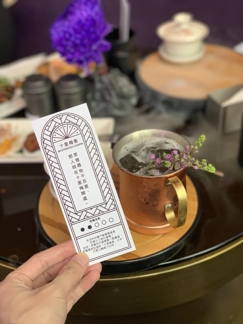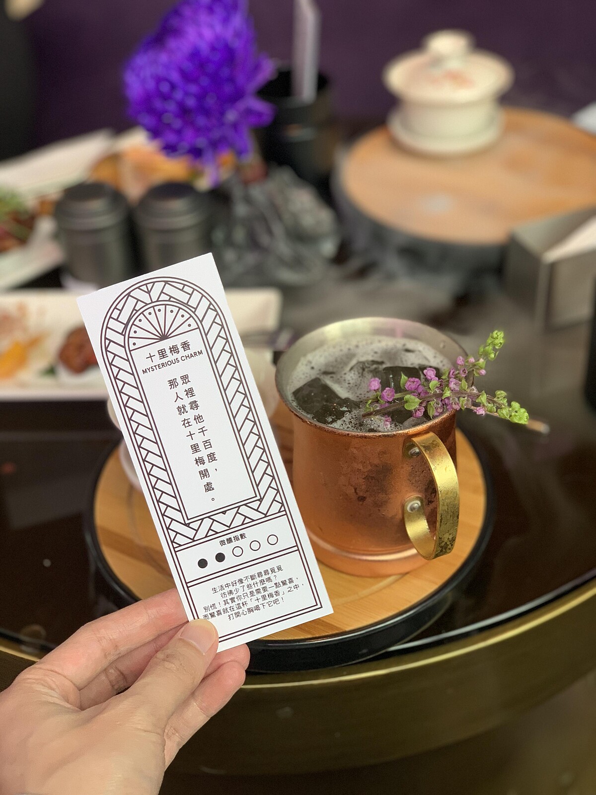 「紫醉茶行」系列一共推出了七款調酒與一款無酒精飲料包含「十里梅香」、「夜太美」、「梨山蜜雪兒」、「獨舞」、「渺渺」、「紫醉衿迷」、「迷魂香」、「夢醒時分」,光酒名就取十分有創意,但究竟是什麼滋味呢?就等待你親自去品嘗囉。