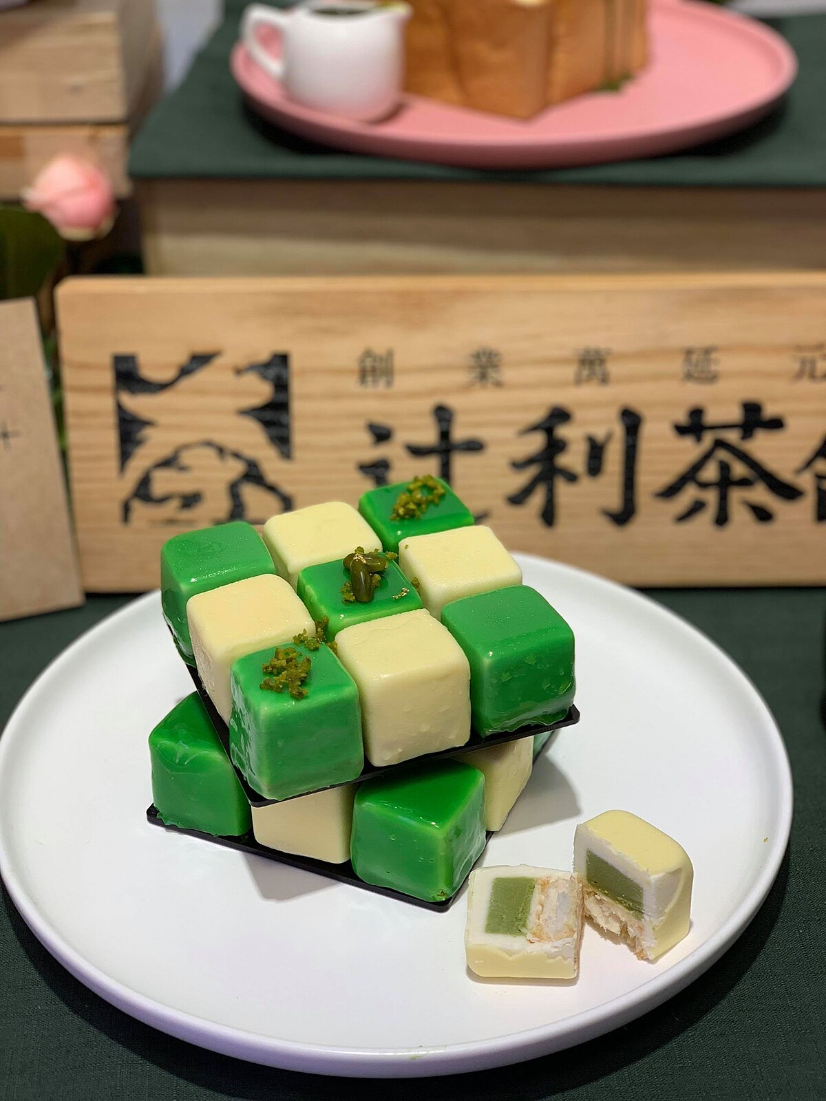 「宇治抹茶金磚」概念源於法國最佳甜點師Cedric Grolet的經典之作Rubik’s Cube,主廚將蛋糕體改以蜜糖吐司磚搭配冰心慕斯呈現,內餡運用自製卡士達香緹為基底,填入濃郁抹茶甘納許,冷凍後分別刷上33%白巧克力及翠綠鏡面淋醬,磚頂則以金箔綴飾,就像魔術方塊般饒富趣味。