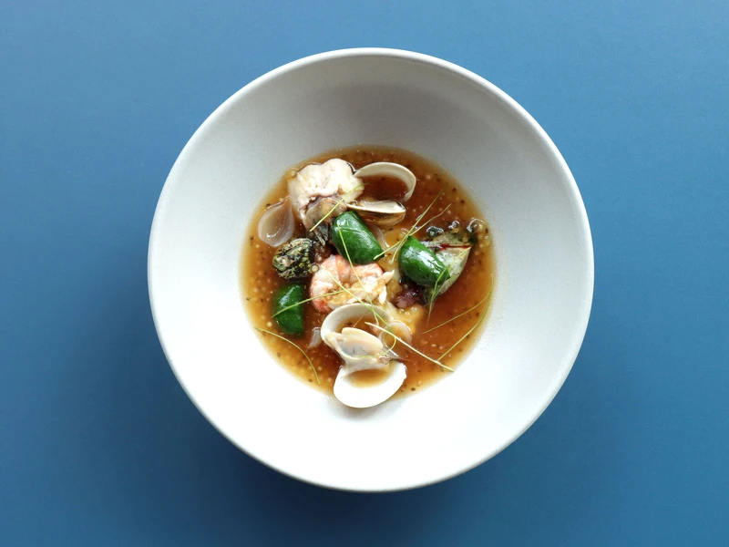 以傳統的當歸牛尾湯作為基底,具有補血益腎、強筋健骨、降低身體濕氣的功效。盛產於西海岸和離島的鵝頸、佛手藤壺及各種甲殼類,罕見地加入奇亞籽和珍珠在鹹食湯品中,增添新奇的口感。