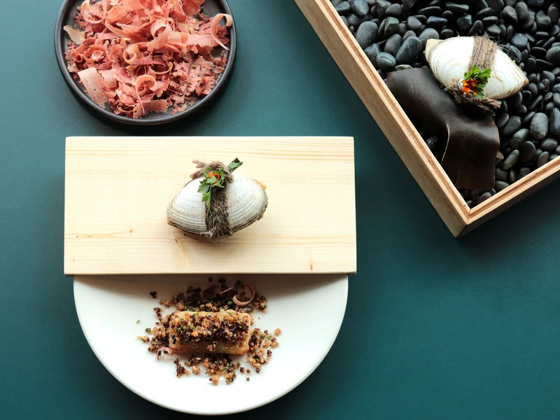 法式傳統肉派(Pâté en croûte),在兩位大廚的心裡和臺灣知名小吃「胡椒餅」有著同樣的地位,純正的法式製作方式烘烤酥皮,佐以在臺灣鮮為人知的朝鮮薊,RAW先蒸後炸的料理手法創造出筍子般的口感,佐以黑豆製成的奶油醬(relish),入口鮮甜且回甘。