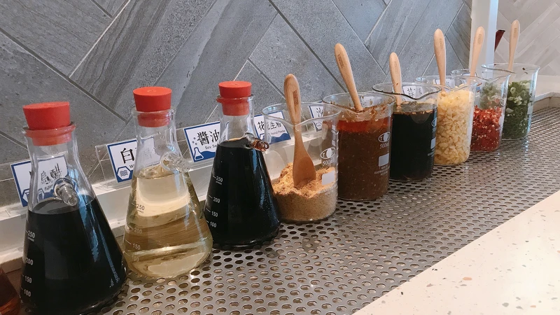 除了有特色石頭火鍋還可以品嘗,也有一般鍋物可以選擇,6款風味湯底X14項推薦肉品X2種肉量選擇X5種精選小食X4款附食與飲料,讓答案有限創意無限,自由搭配出屬於自己的美味方程式。湯頭共有六種風味,經典原味、麻辣風味、泡菜風味、燒酒風味、番茄風味、啤酒麻油風味。附食除了基本的白飯還有滷肉飯、麻油雞麵線。連醬料都做成像實驗室酒精杯一樣可愛!