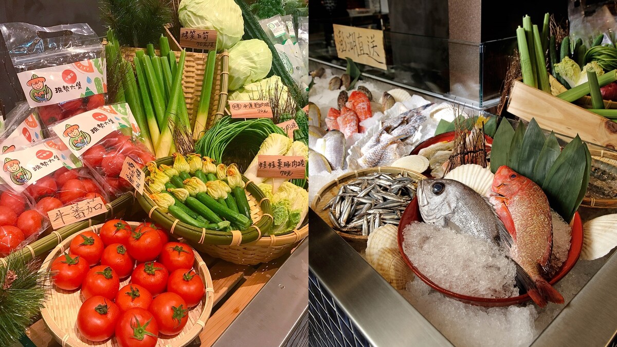 除了澎湖海鮮之外,更將各式小農食材搬進了店面,像是市集的一般,聚集了各種小農食材從桃園青年農民共同種植無農藥水耕蔬菜的水野菜品牌、品質堪稱全台第一的埔里礦泉茭白筍、新竹尖石的櫛瓜花等有機小農食材,讓客人於現場選食材後,再由師傅親自料理,讓新鮮不只看得到也吃得到。