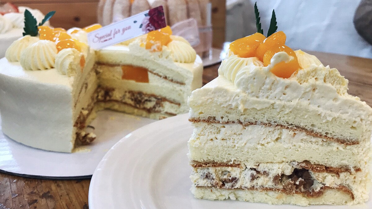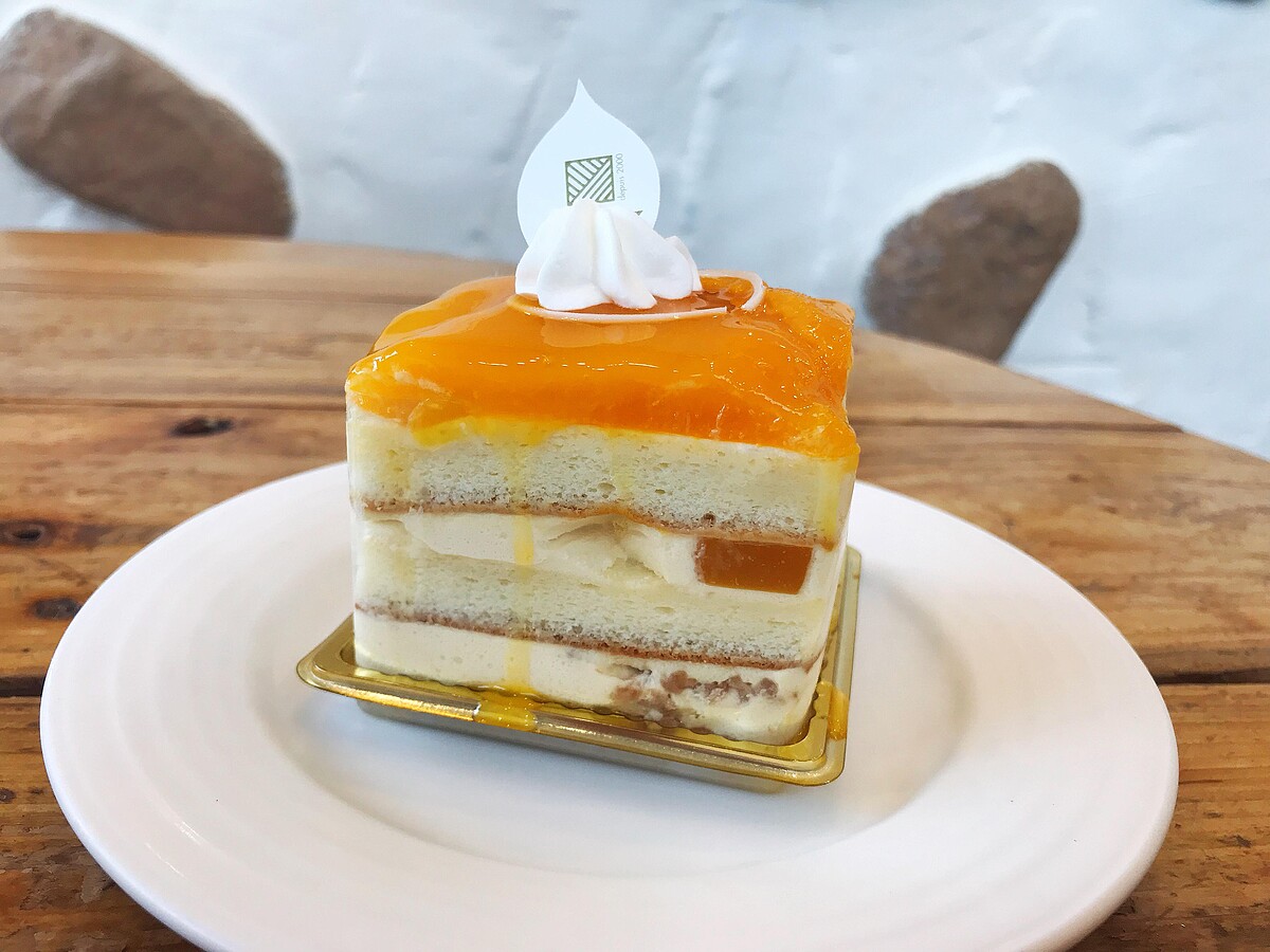 蛋糕是新鮮的蓬鬆感,柔軟裡有微微Q彈,上面佈滿了新鮮水果,外表看不出芒果的蹤跡,但內餡隱藏著芒果果泥豐腴飽滿的香氣和細緻的滑順感,超適合夏天品嘗!
