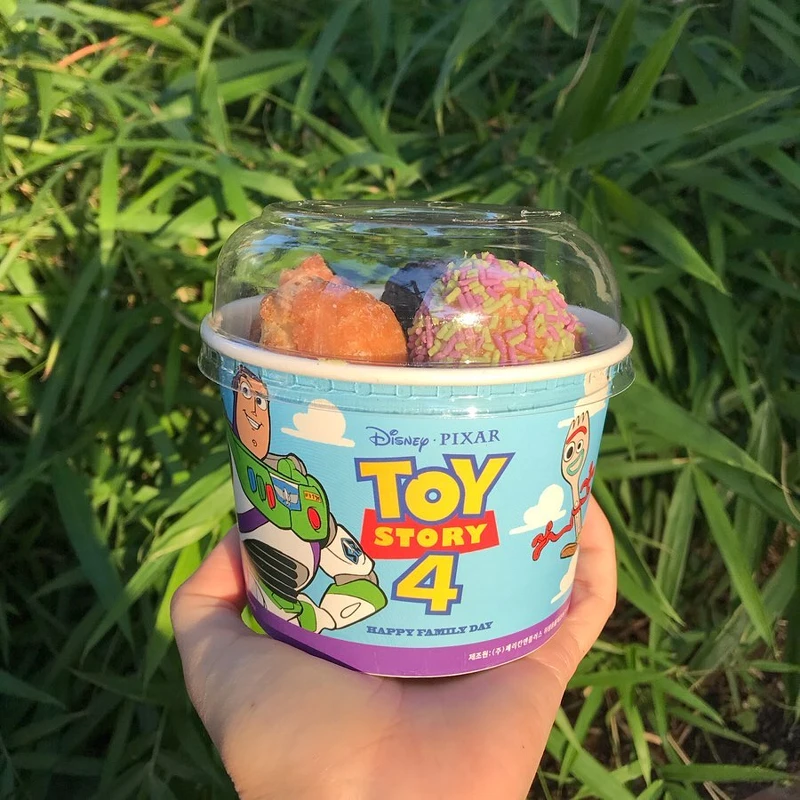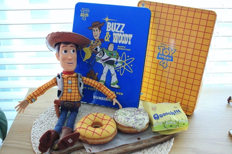 韓國Dunkin Donuts甜甜圈在6月初推出聯名,以主角胡迪、巴斯光年、三眼怪推出3種口味的甜甜圈,胡迪口味的外表以牛仔代表的格紋圖案,內餡則是香蕉口味的甜甜圈、巴斯光年為牛奶年甜甜圈、三眼怪是方形的馬鈴薯口味!買了甜甜圈以外還可以透過加購價的方式獲得獨家造型外盒,外盒使用鐵的材質,吃完甜甜圈後還可以拿來收納生活小物,超級實用~很值得大家加購!