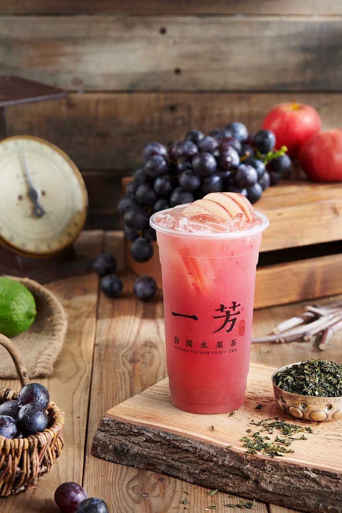 一芳水果茶最新推出「大村葡萄水果茶」,特別嚴選彰化大村巨峰葡萄品種,秉持不添加濃縮汁的堅持,使用大量葡萄整顆連皮榨汁新鮮現打,依每串葡萄果皮色澤不同,每杯飲品呈現不同風貌的唯美紫紅色,完全是炎夏必來一杯的消暑飲品。