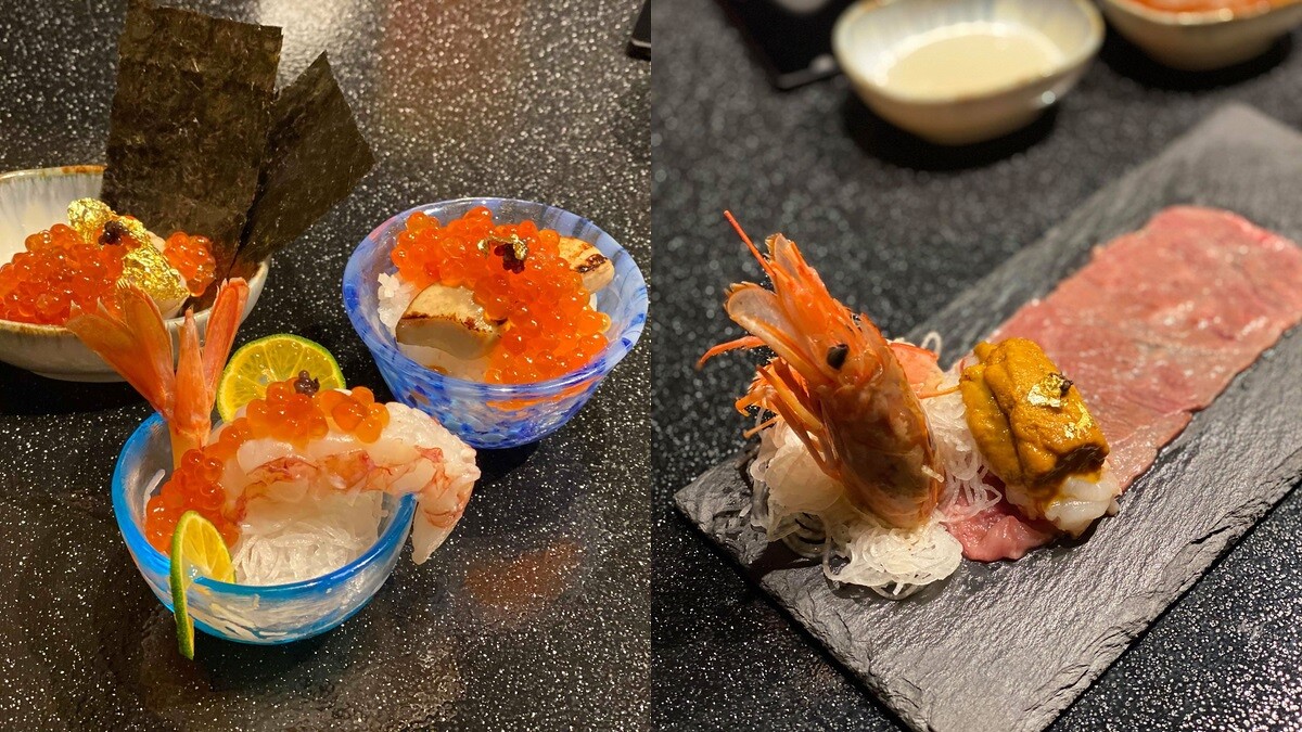 前菜:海膽干貝、炙燒天使紅蝦杯、匈牙利鴨肝鮭魚卵杯、和牛海膽紅蝦卷