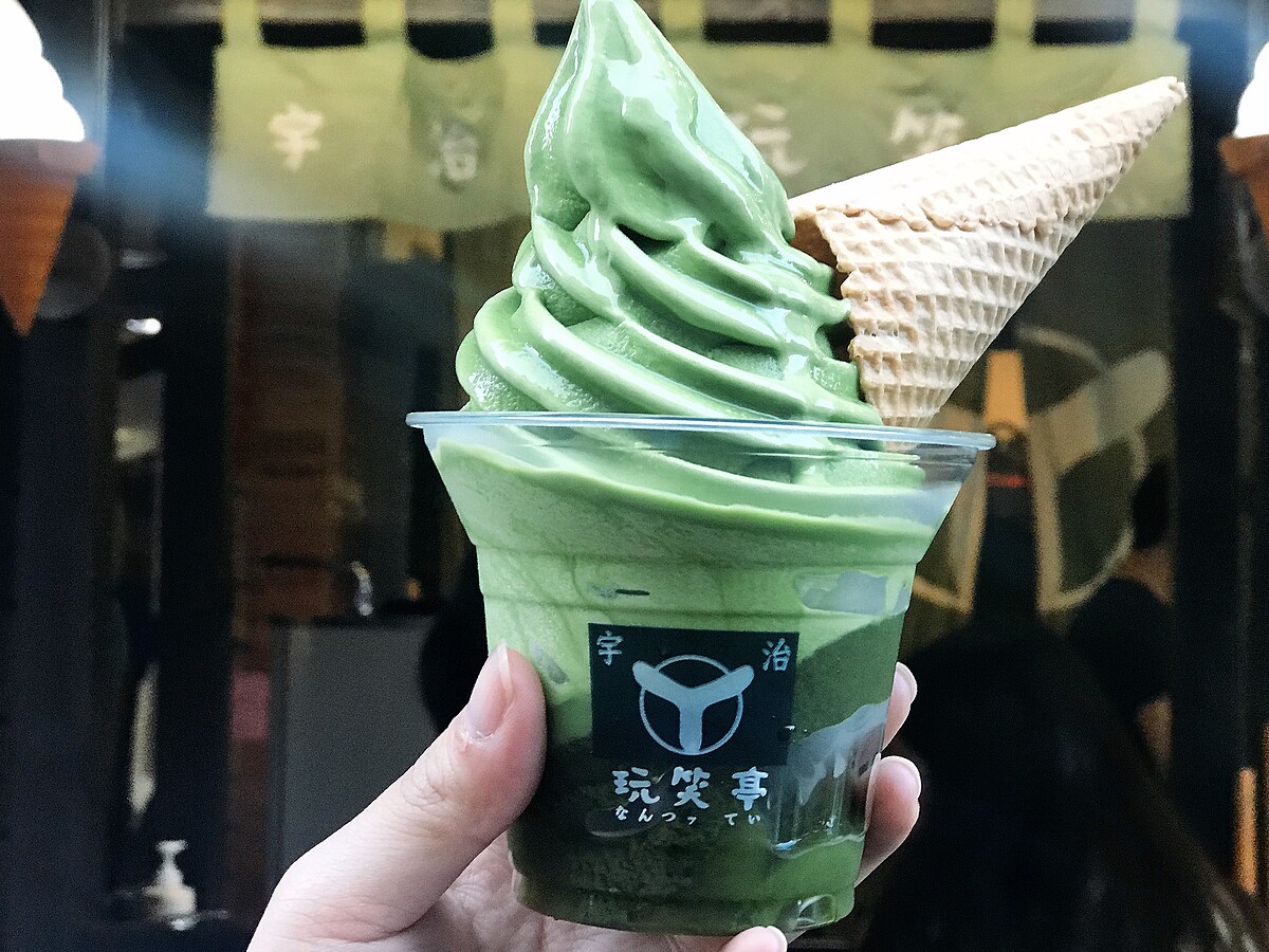 宇治抹茶冰淇淋初訪必點的招牌口味!宇治.玩笑亭十分用心的是抹茶冰淇淋會使用不同的抹茶來調配,店內會使用兩款抹茶丸久小山園、以及伊藤久右衛門的抹茶口味來輪流,讓顧客即使每天吃抹茶口味都能夠吃到不同的美味!