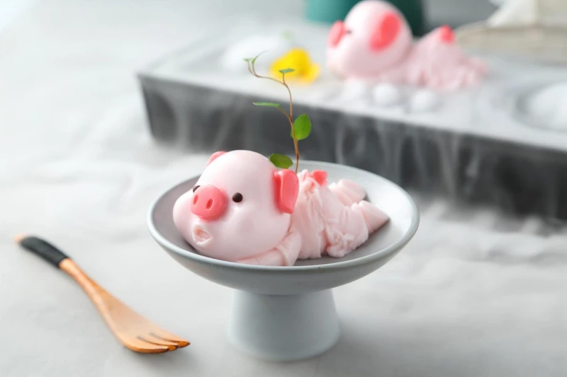 「得意小豬」ㄉㄨㄞㄉㄨㄞ上桌,彷彿如正在泡澡般舒服的可愛小豬,是此次大推薦的奶酪風格甜點。外形極度可愛的粉色小豬,製作工序相當繁複,必須先根據色澤不同,再分層完成不同步驟,時間的掌握更是需具功力與經驗。可愛到令人忍不住下手的得意小豬,搭配黑白淡奶的溫和奶香,甜而不膩,絕對必點!