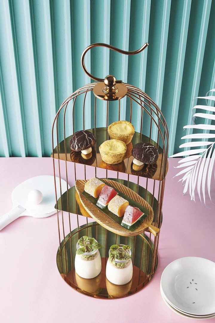 「限量鳥籠組」延續香港常見的英式下午茶概念,高雅的午茶鳥籠組裡一次可嚐到點心師傅精心製作的五款不同風味港點。首創業界先驅的經典香菇外型的「松露香菇包」、外酥內嫩,蛋香濃郁的「葡式蛋撻」、將奶酪大升級的「田園盆栽」之外,選用愛文芒果,經多道工序製作的「椰香芒卷」,以及就像喝西瓜汁般清爽,純西瓜汁製作的「西瓜凍糕」共五款選擇,最適合與姊妹淘來場既好看、好拍又好吃的下午茶約會。