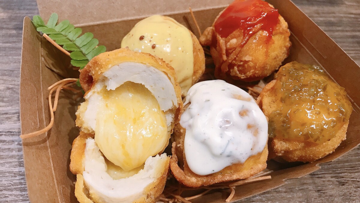 圓滾滾的外型也是由雞塊組成的,但裡面藏有超邪惡的3種起司,外酥內軟咬下的瞬間不僅爆漿還會牽絲~