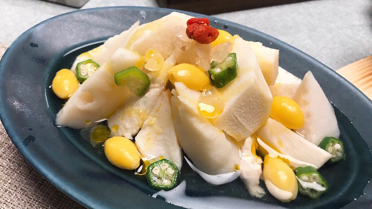 當令新鮮綠竹筍、秋葵、白果以及富含膠原蛋白的高雪蓮子等豐富食材,清蒸最能鎖住筍的鮮美甘甜,並佐簡單調味,起鍋前淋上以紅蘿蔔提煉的紅油添色與滋潤。