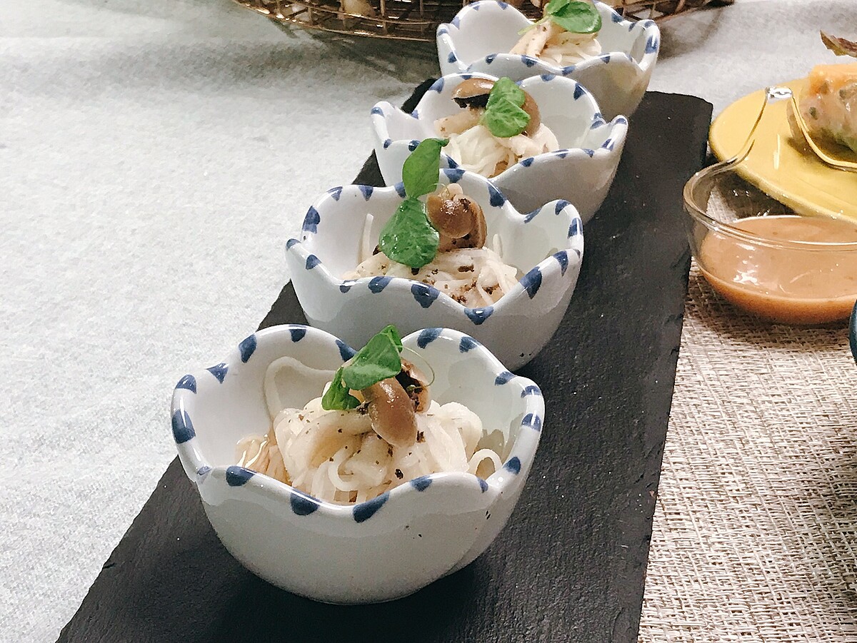 當令竹筍清蒸鎖住原汁香甜,細切成筍麵,淋上香菇昆布醬汁,最後點綴松露風味鴻熹菇。