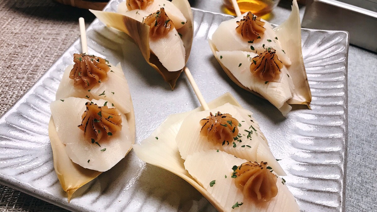 當令竹筍清蒸鎖住原汁香甜,切塊串烤讓表面略具脆度,擠上特製田樂燒醬,再烘烤一會兒,將田樂醬與竹筍的香氣發揮更極致。