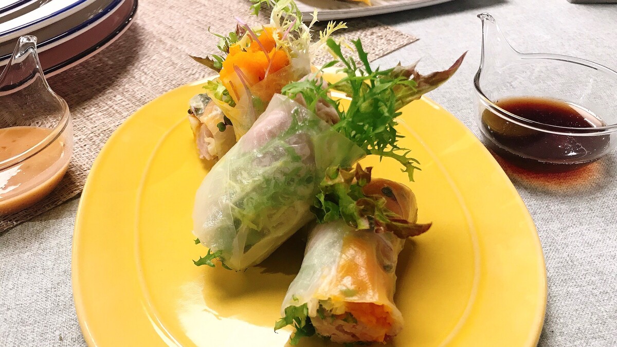 選用夏季當令綠竹筍和芋頭、南瓜、綠菊苣與紫高麗菜,以越南米片包裹捲起,單吃原味清爽,沾上胡麻醬或辣醬,層次有味。