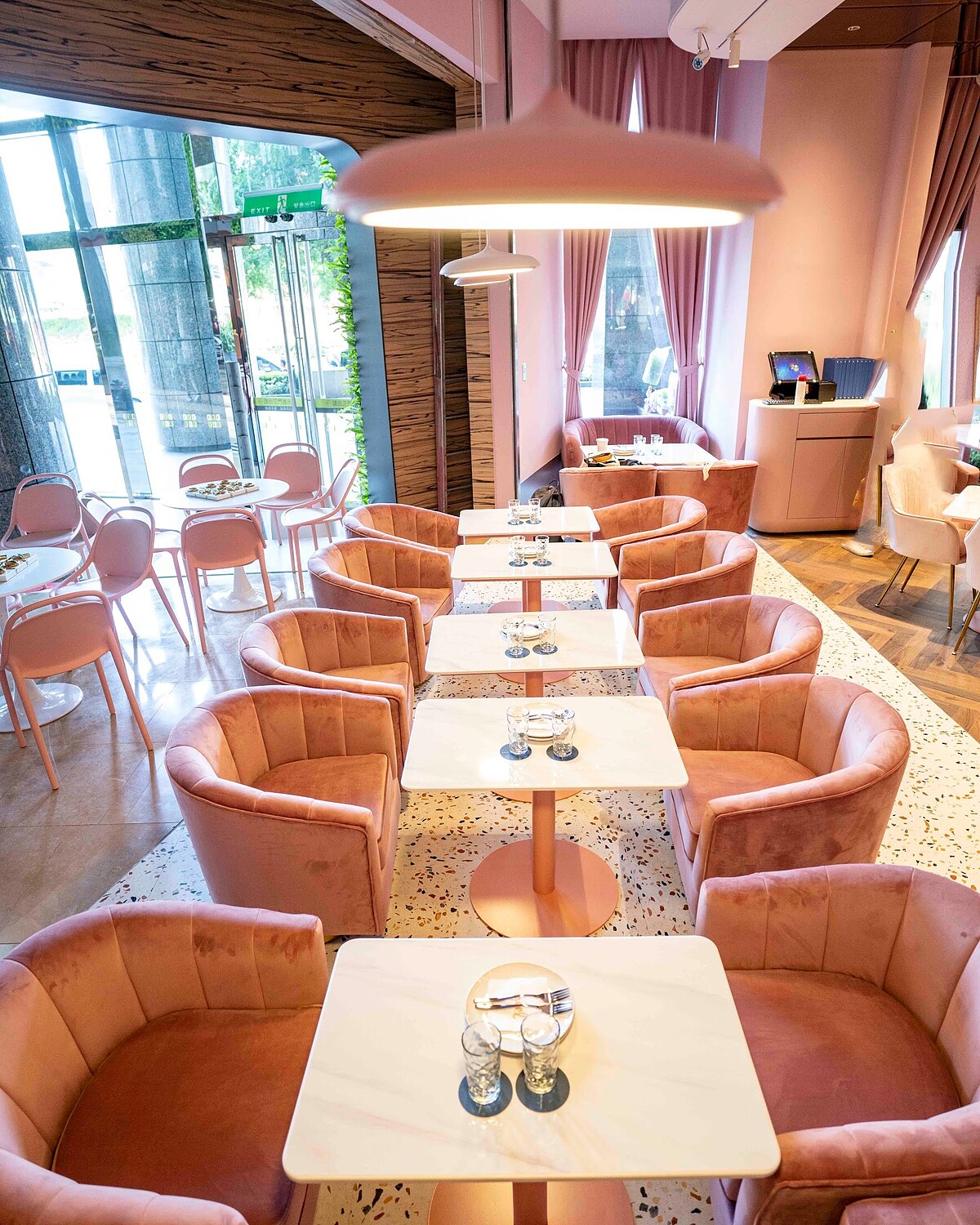 petit doux.微兜京站店店面與原先的光復店、永康店感受截然不同,同樣有著petit doux.微兜的精神,但每間分店確有各自不同的風格。京站店從沙發到裝潢佈滿乾燥玫瑰粉、搭配滿牆的浪漫花草,店內充滿優雅浪漫的氛圍,以開放式的空間、顯得更加舒適!超適合揪姊妹們一起來場療癒系美食之旅~