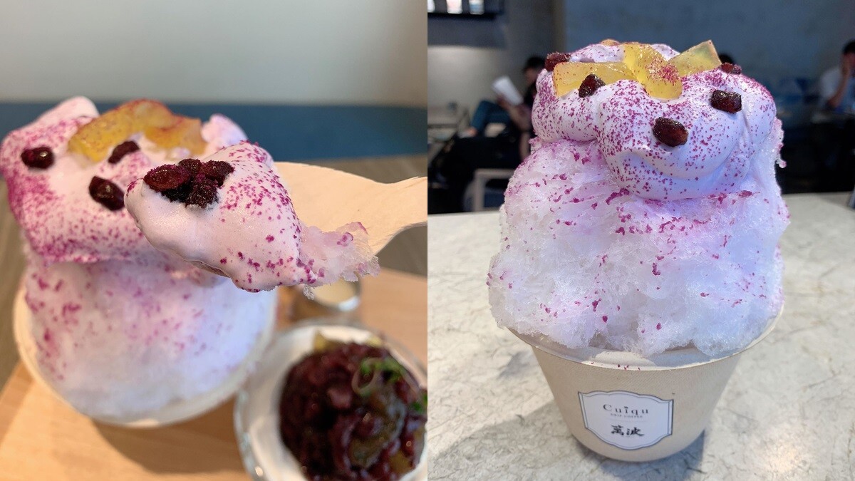 其中「紅豆粉粿鮮奶」是在日式鵝絨刨冰上覆蓋一層紫薯奶霜,淋上台灣小農煉乳,接著以紅豆和粉粿點綴裝飾,口感細緻的鵝絨刨冰配上紅豆粉粿,不僅沁涼消暑,粉紫色的外觀更是少女心爆發的甜品之一。