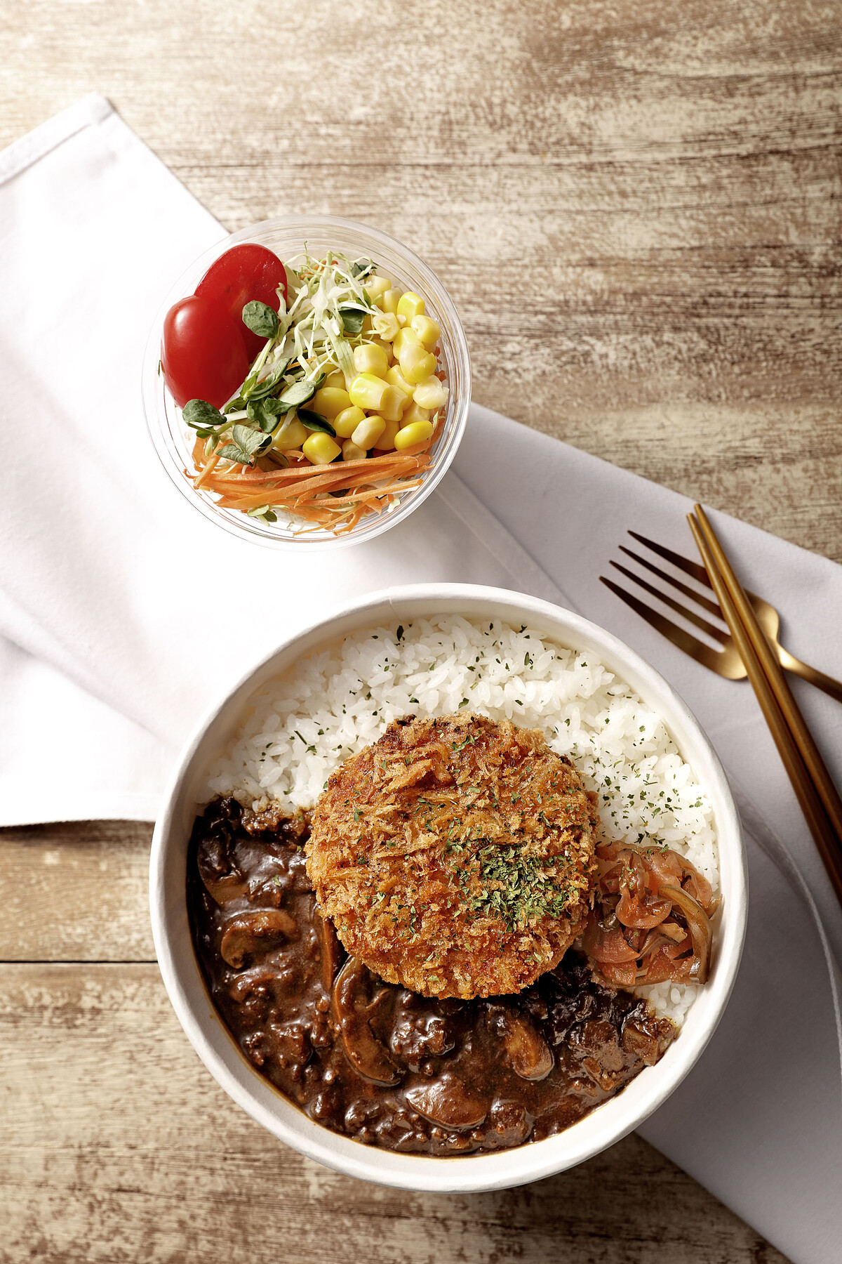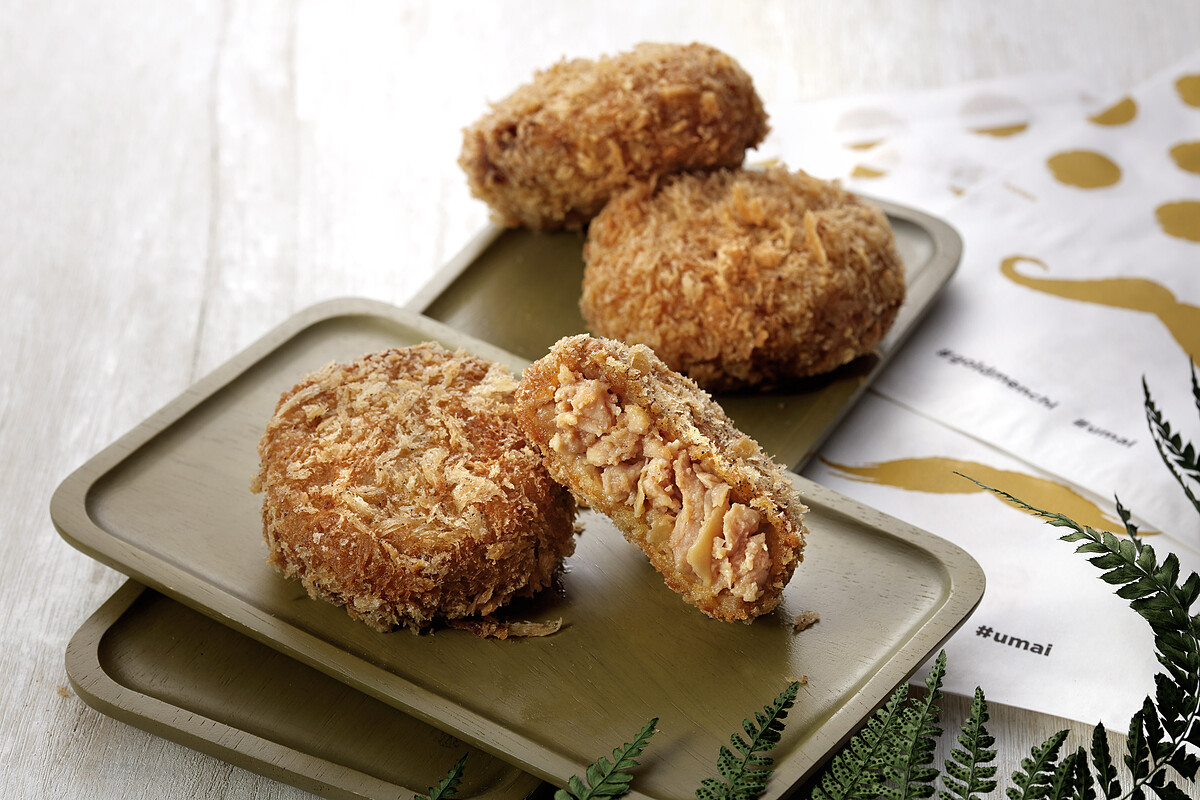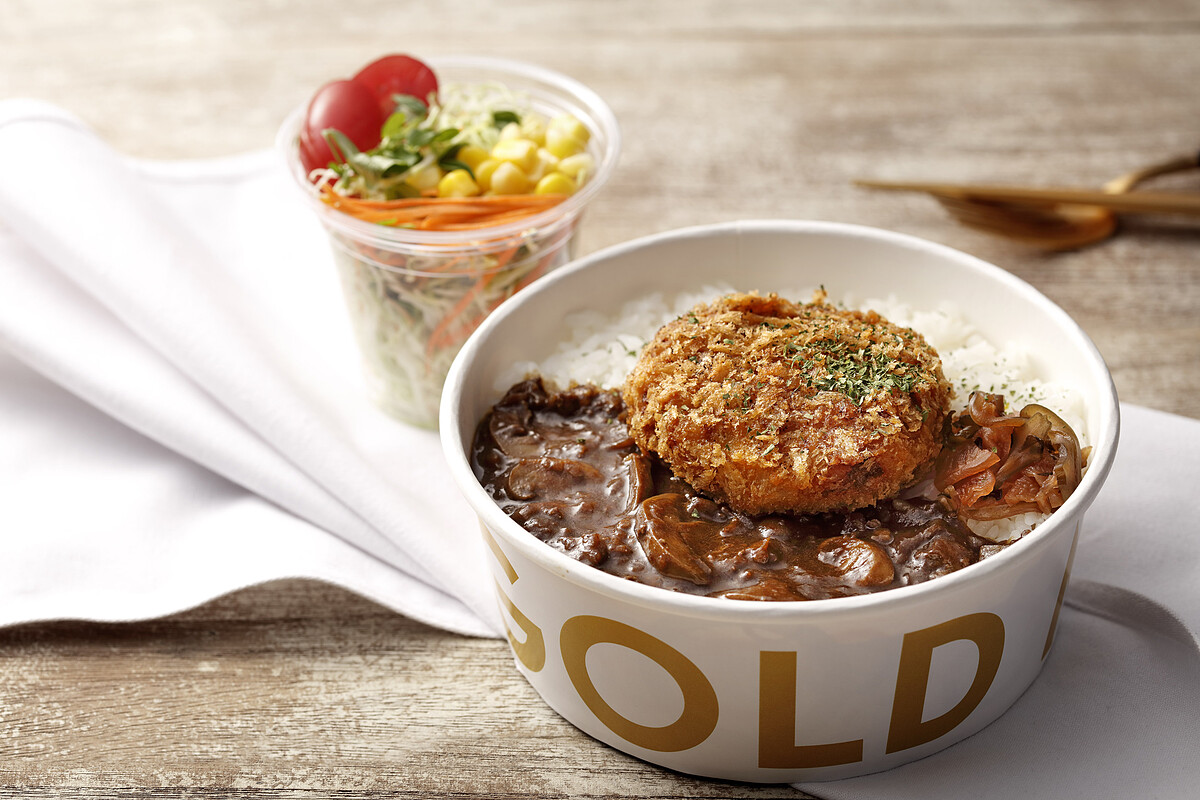 是將日本的國民美食“咖哩”與“炸肉餅”的結合的全新商品,兩者在日本飲食中是不可或缺的重要角色!咖哩,是以蔬菜本身的自然甜度,再將兩種不同風味咖哩做調配,加入起司與椰漿提升口感層次,吃得到洋蔥、洋菇與豬絞肉的風味搭配;而外觀也以高級咖哩店才有的棕咖啡色咖哩來顯現出質感,呈現出色香味俱全的美味料裡。