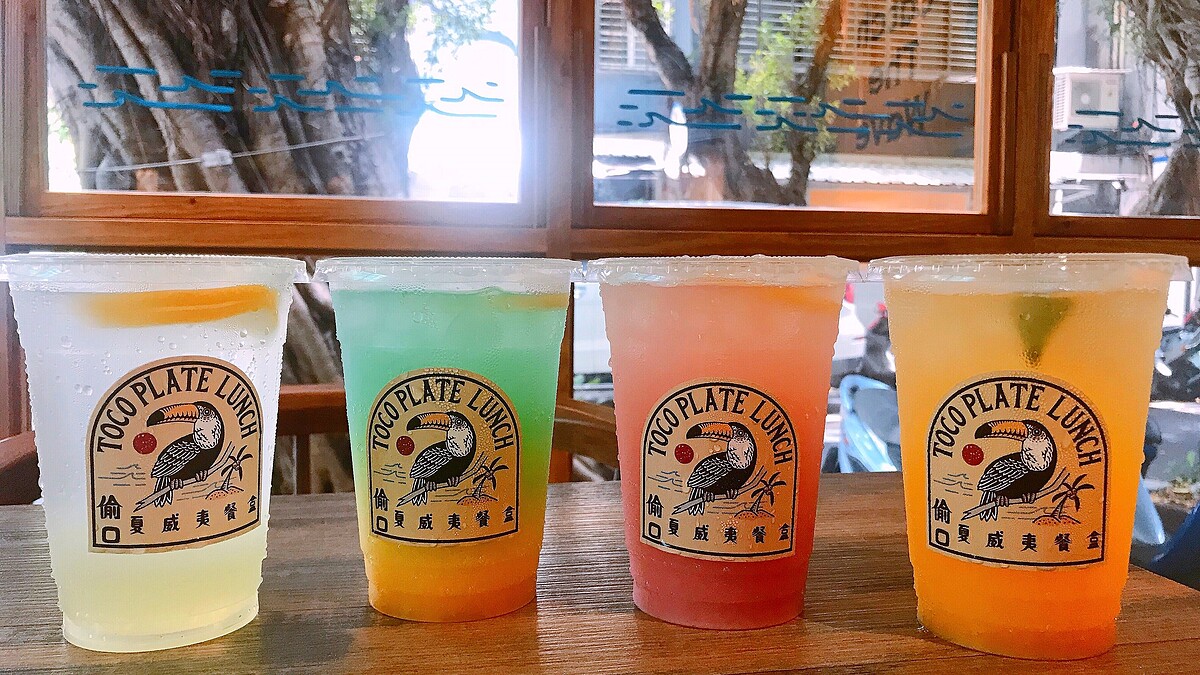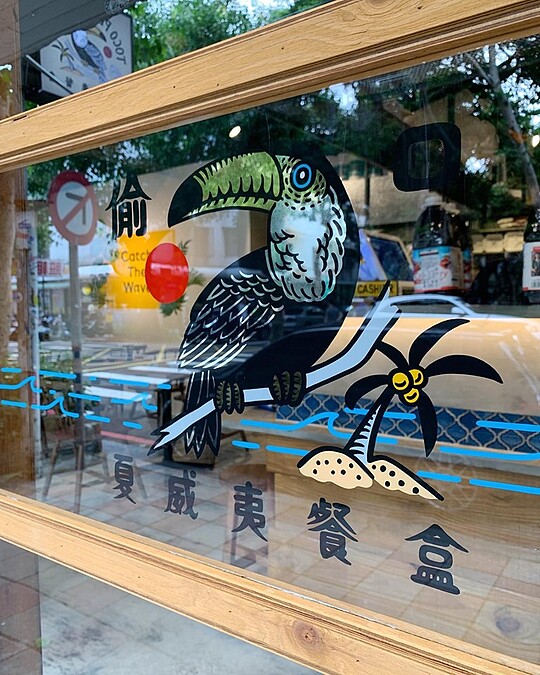這些全部都來自於一位店內的員工RON,但RON的原先本業是電繪、手繪師。夏威夷餐盒的LOGO使用古早技術的金箔製作而成,在早期有許多師傅才會使用此貼金藝術,這項技藝幾乎快要失傳!RON以往的作品都採美式、日式為主,這次更大膽的挑戰夏威夷海洋風。讓店內充滿度假感~每個地方都超好拍~