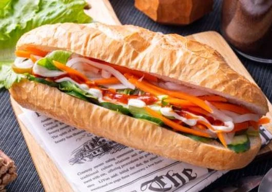 1958年在一間越南的麵包店首度利用法國麵包搭配亞洲人餡料、醃蘿波,豬肝醬、叉燒肉,後來在當地就簡稱為「粄米」,法式飲食文化逐漸淺移默化結合了法式與越式的口味,越法三明治便是其中一個代表!