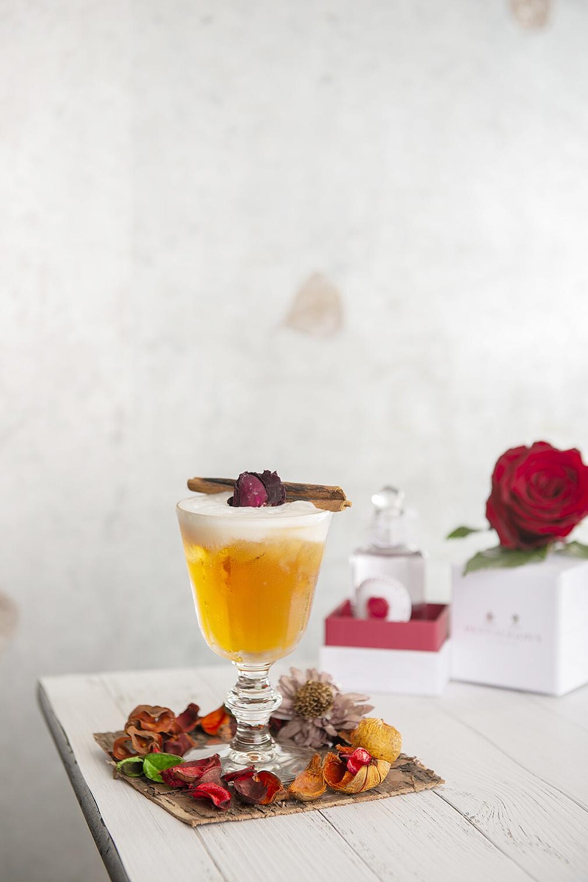 將坦奎利倫敦琴酒 (Rose infused Tanqueray)、阿瑪雷托杏仁甜烈酒 (Amaretto)、艾普羅香甜酒 (Aperol)、肉桂糖漿和檸檬汁倒入雪克杯中,加入冰塊後搖勻再倒入酒杯,上層擠上玫瑰奶泡,點綴乾燥玫瑰花瓣,入口即可感受猶如伊莉莎白玫瑰香水不同層次的香調餘韻。每杯售價NT$390