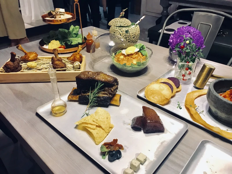 「She_Design TAPAS SOJU BAR」每樣餐點都具有獨特的創意,結合滴管、試管、瓶罐等器品,在品嚐的過程中從沾、剝、敲、燒、擠、拌、噴…等動作。讓吃美食就像是在做一道實驗的趣味體驗!為了讓美食與酒類能有更創新的結合,多款菜色以酒入菜或,製作成調味料提升美味的層次。