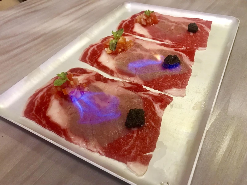 選用美國Prime等級肋眼部位薄切,先淋上生命之水再燒炙喜愛的熟度,搭配松露醬與自製莎莎醬,捲起來一口品嚐,感受鮮嫩的肉質與層次在口中綻放。