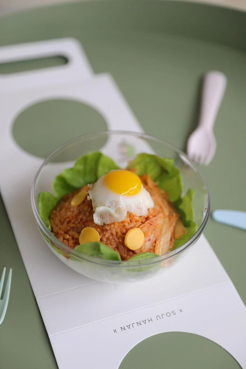 像一顆泡菜星球超可愛~將泡菜炒飯裝入透明的球體中,內用外帶都很適合,!