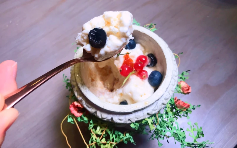 將希臘優格製作成冰淇淋,最底層的脆餅搭配黑橄欖熬煮的焦糖、自製蕃茄果醬與新鮮藍莓,品嚐起來清爽無負擔。