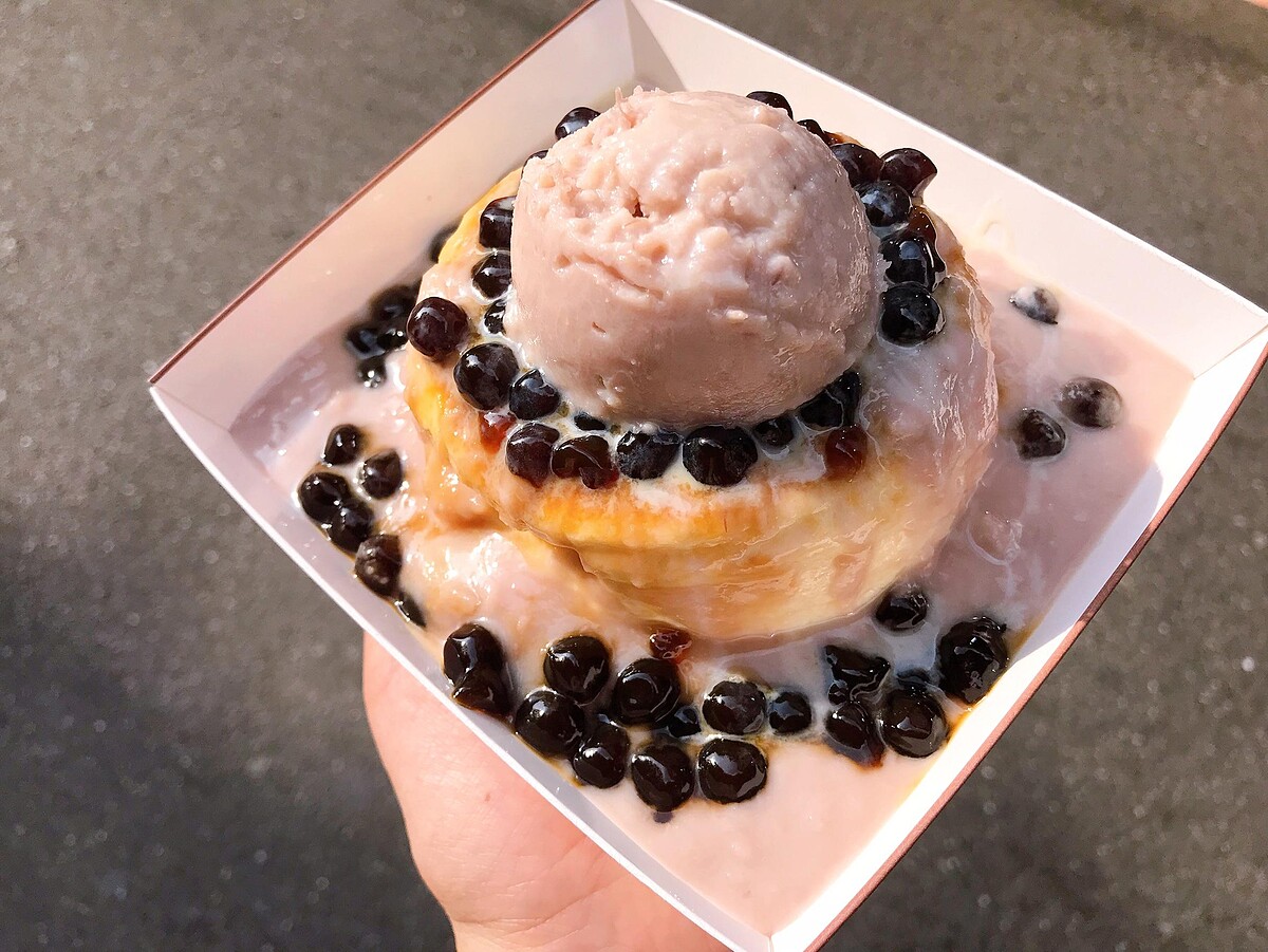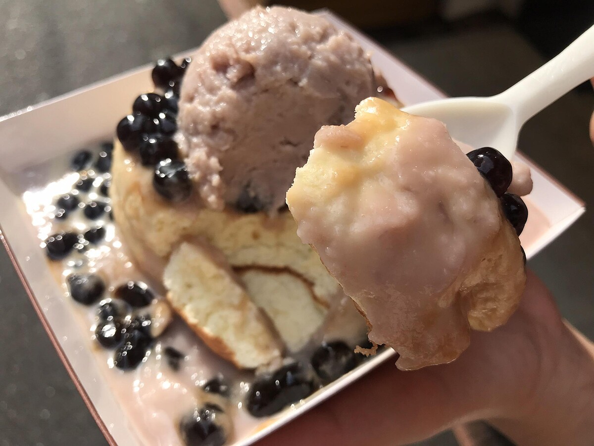 芋頭醬搭配鬆軟、濕潤的舒芙蕾,上面還有一球綿密的芋泥,品嚐起來不會太甜,加上帶有些微蜂蜜香的珍珠!整體超澎派~